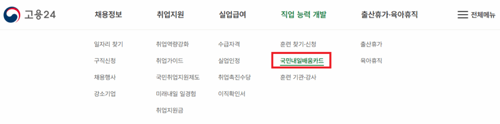 - 고용24홈페이지 접속하기 👉 ‘직업능력개발’ 메뉴클릭 👉 ‘국민내일배움카드’ 메뉴 클릭