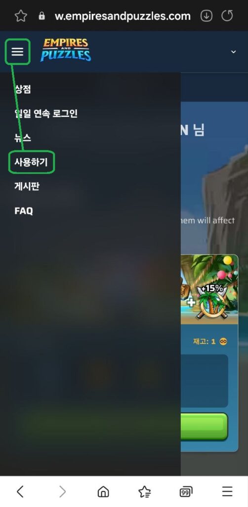 🕹️5. 다시 홈페이지로 돌아와서 좌측화면 상단의 [三]를 클릭하면 또 다른 카테고리가 나오게 되는데 이 때 ‘사용하기’ 메뉴에 들어가시면 엠파이어 &퍼즐에서 이벤트를 진행할 때마다 주어지는 ‘쿠폰번호’를 입력하고 해당 보상을 무료로 수령하실 수 있습니다. 생각보다 좋은 보상들이 많기 때문에 놓치지 마시고 꼭 수령하시길 바랍니다. 그럼 즐거운 게임되시길 바랍니다. 🤗