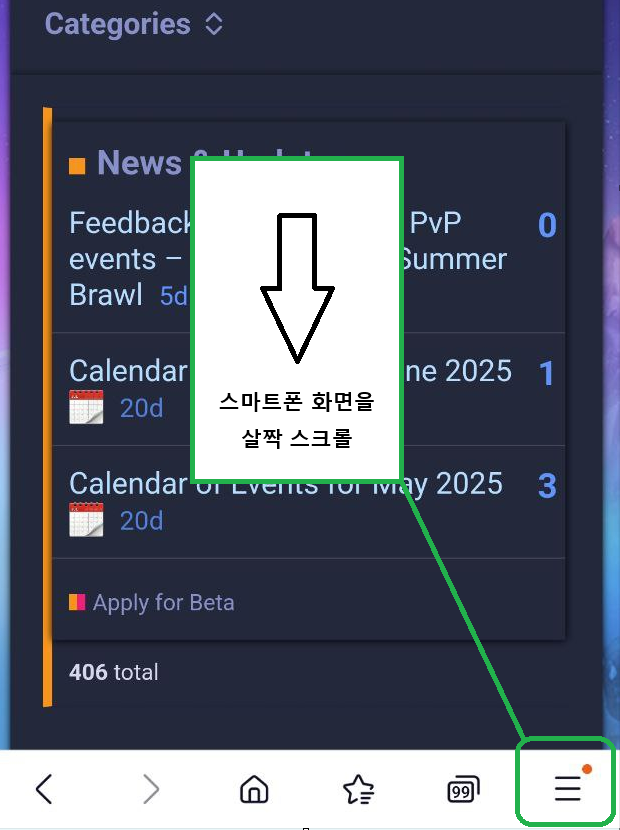 🕹️2. 홈페이지 접속 후 스마트폰 화면을 살짝 스크롤하여 내리면 스마트폰 하단 오른쪽에 [三] 모양의 메뉴가 나타나는데 해당 메뉴를 클릭합니다.
