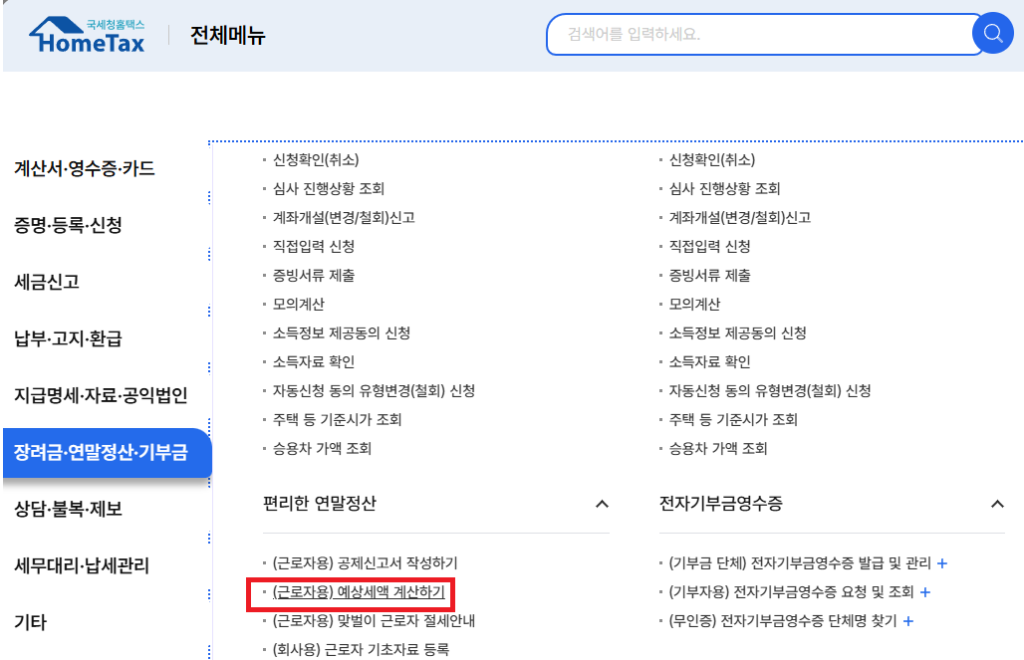 장려금/연말정산/기부금 →예상세액 계산하기를 선택합니다. - 총급여액, 기납부세액, 각종 소득공제 및 세액공제 항목을 입력합니다.